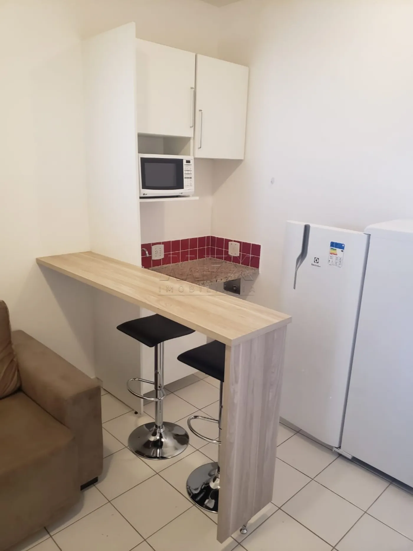 Sofá retrátil 2 lugares, mesa de canto, mesa com 2 banquetas, geladeira, micro-ondas, rack, Tv 32 polegadas LED, cama de casal, armário com mesa de trabalho e cadeira, ar condicionado.