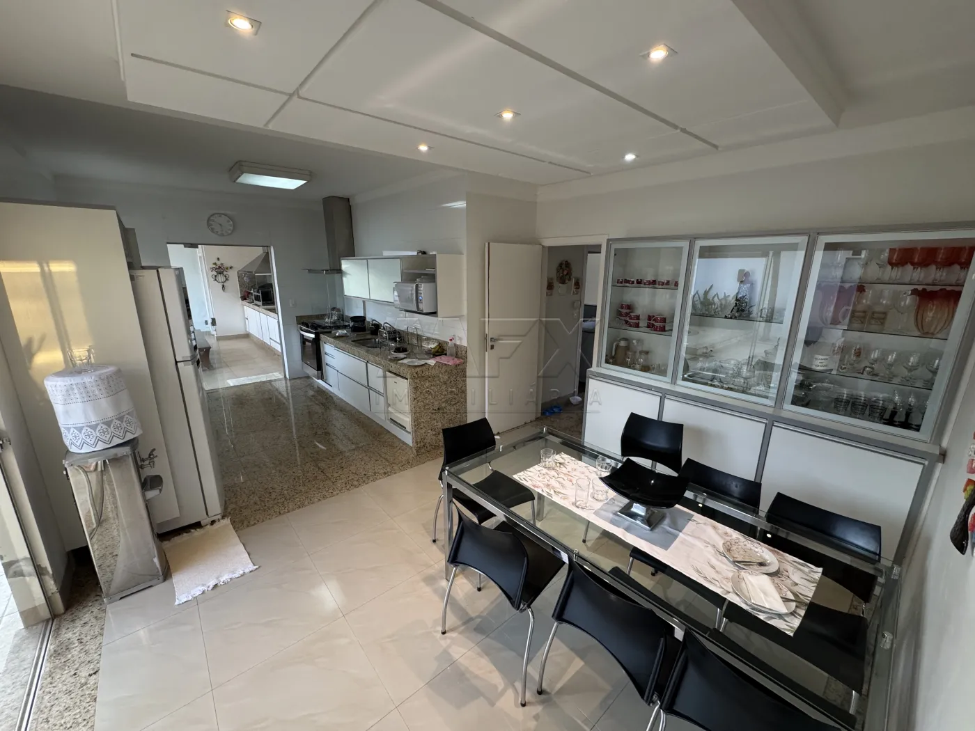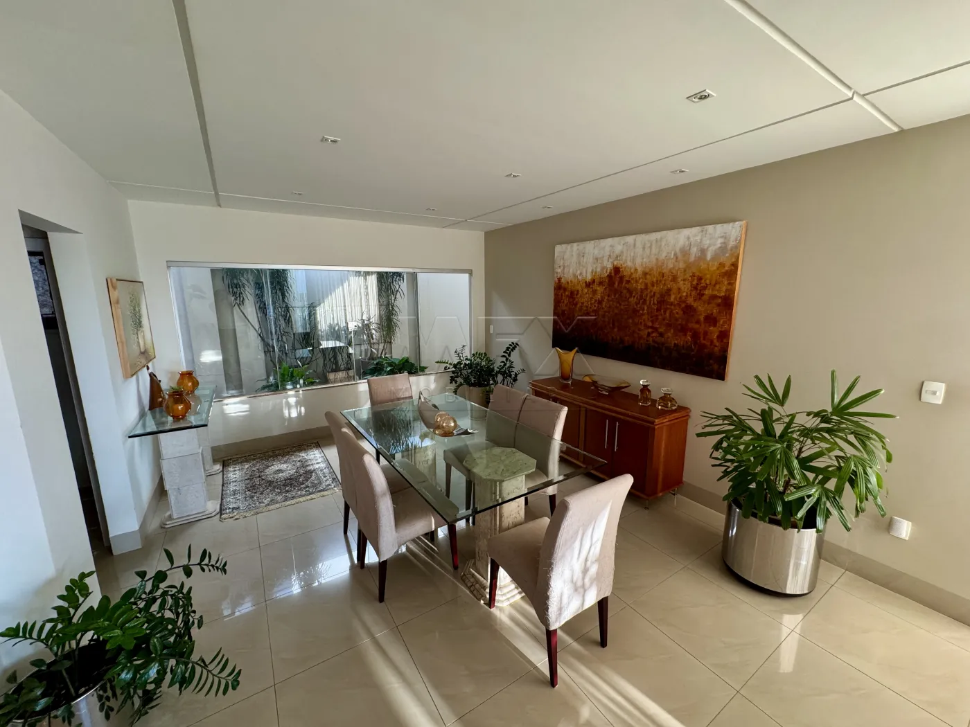 Sala de estar com pé direito duplo, integrada com sala de jantar, lavabo, cozinha planejada e com vista para área de lazer, toda em vidro blindex proporcionando luz natural e uma bela vista de toda a casa.