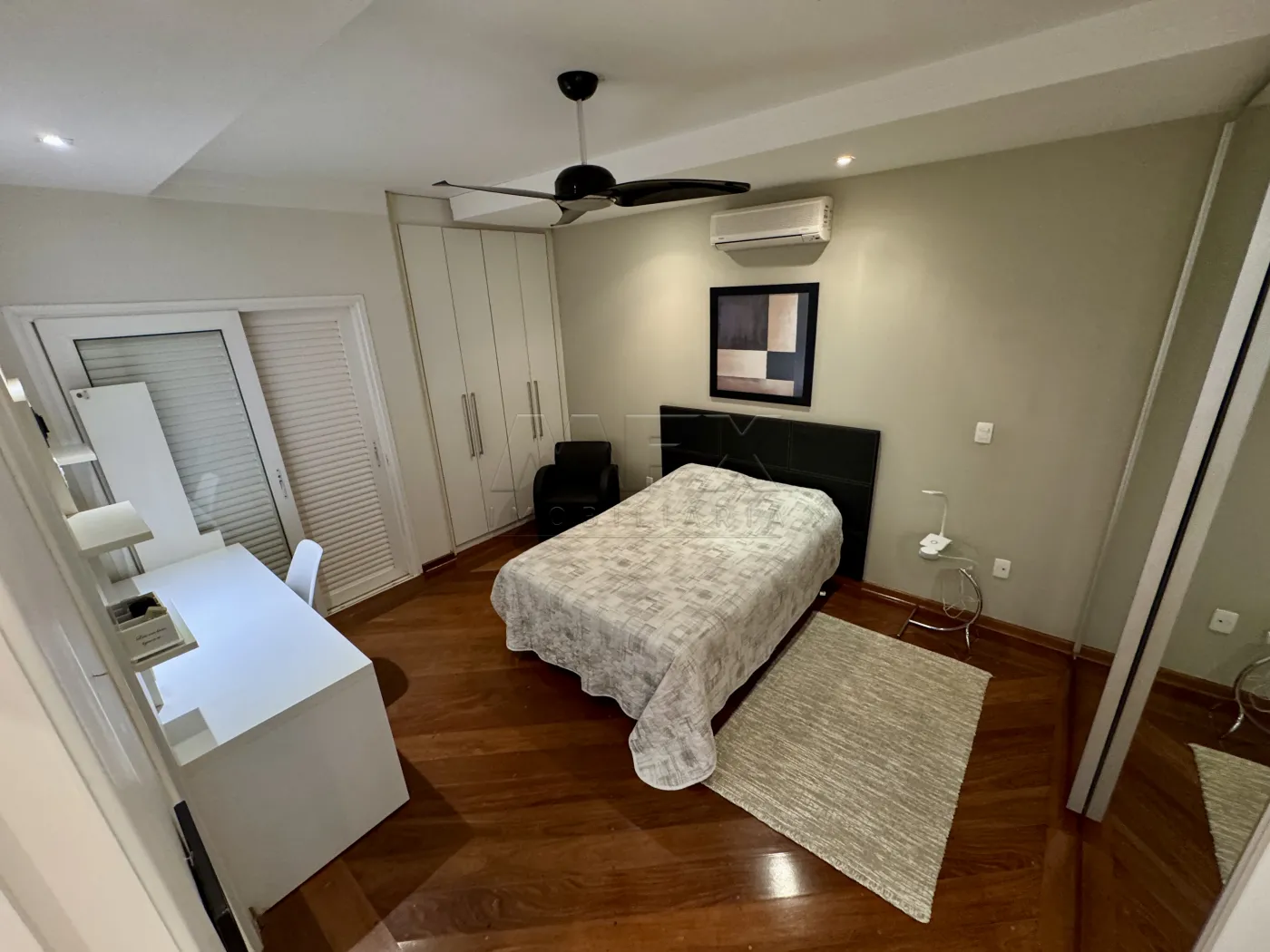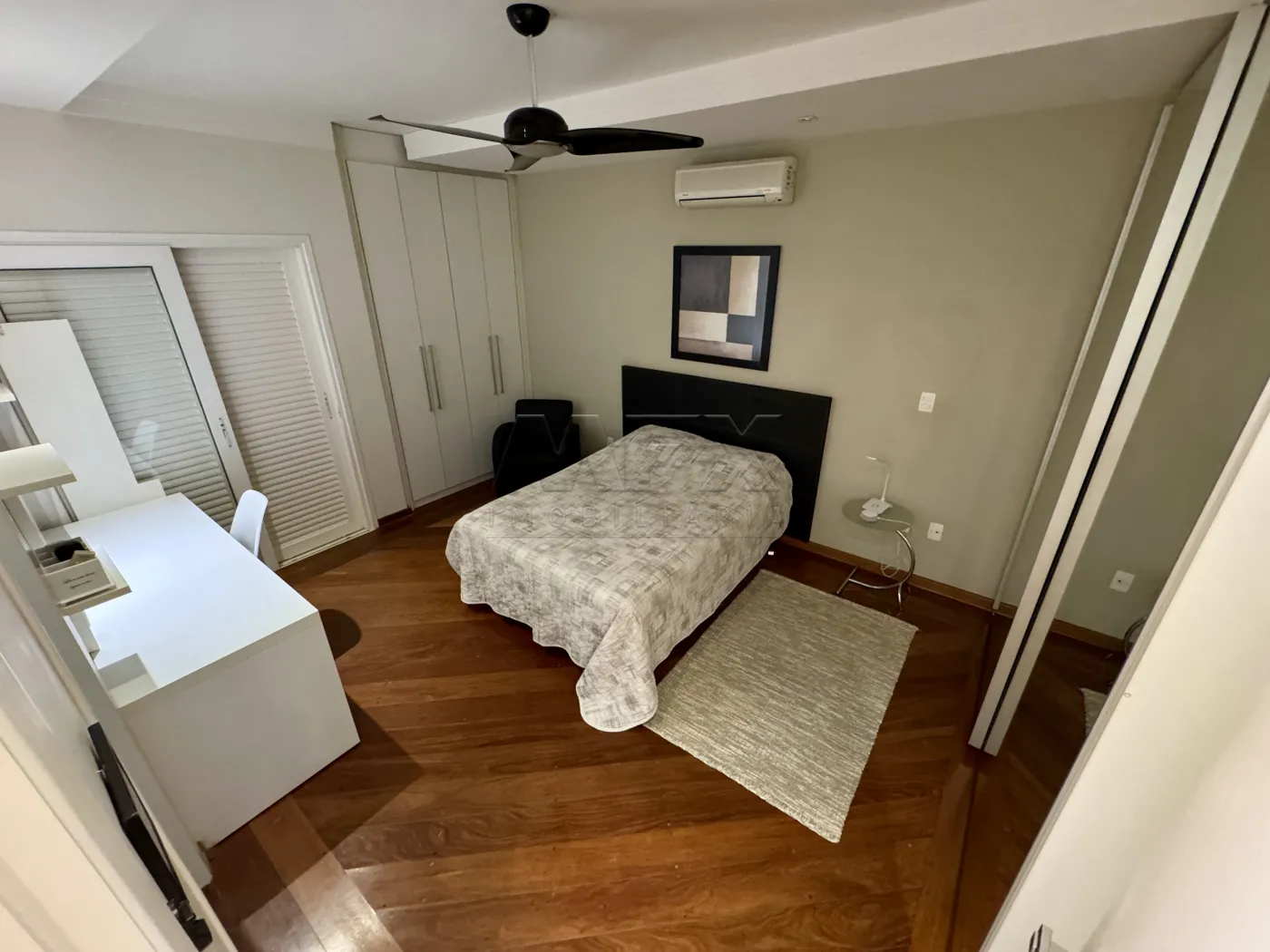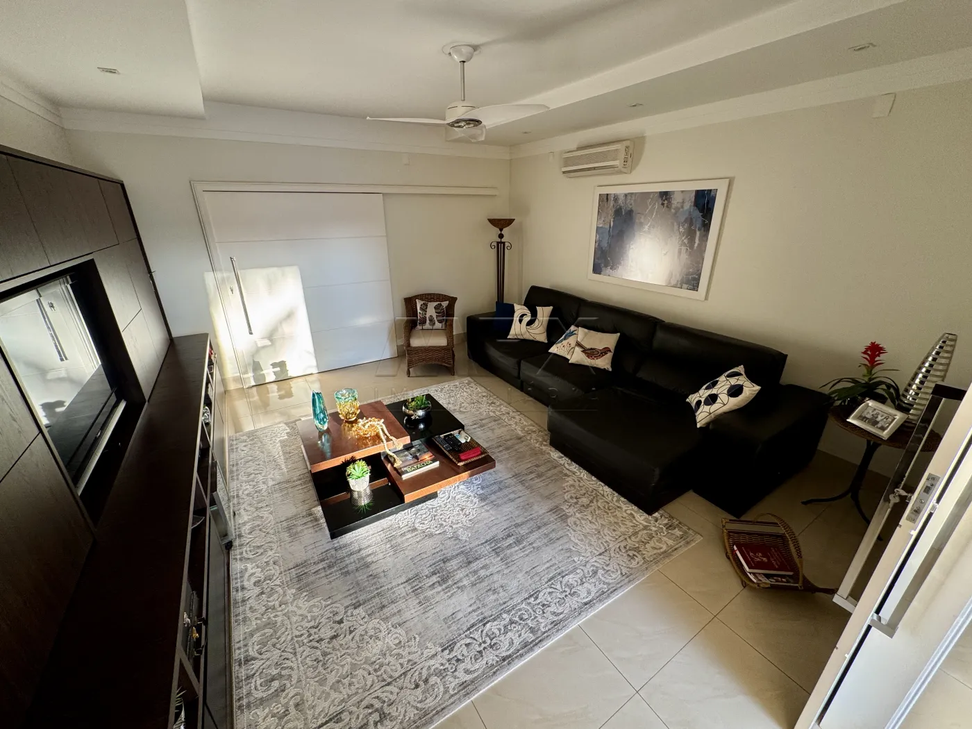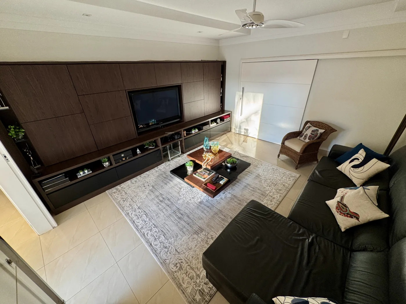Sala de TV com Home, São 4 suítes bem espaçosas, todas com porta Balcão e acesso ao corredor lateral da casa, todas com armários planejados, ventilador de teto e ar condicionado.