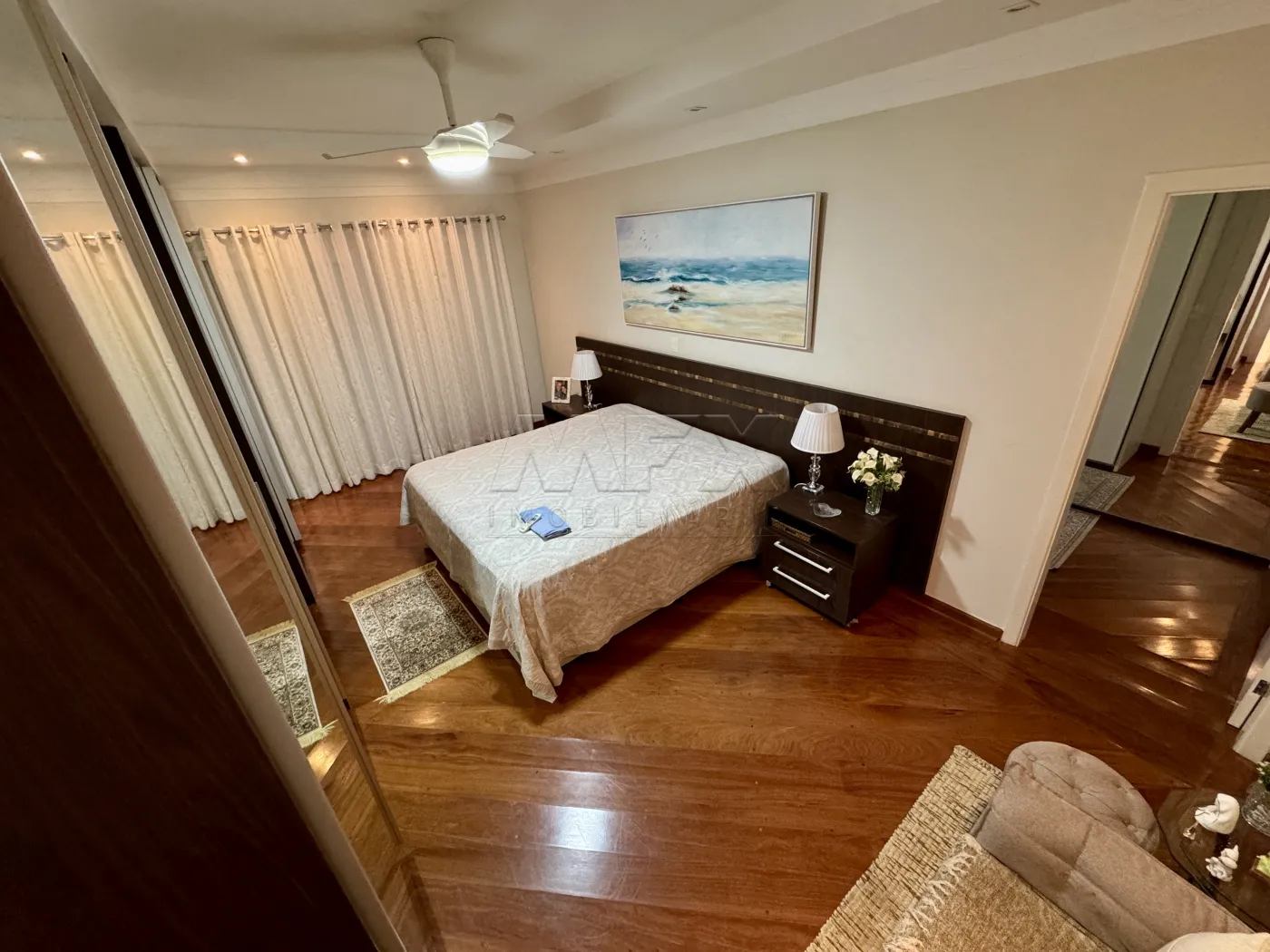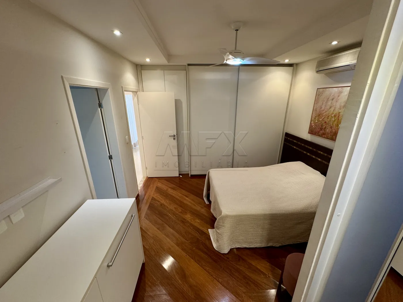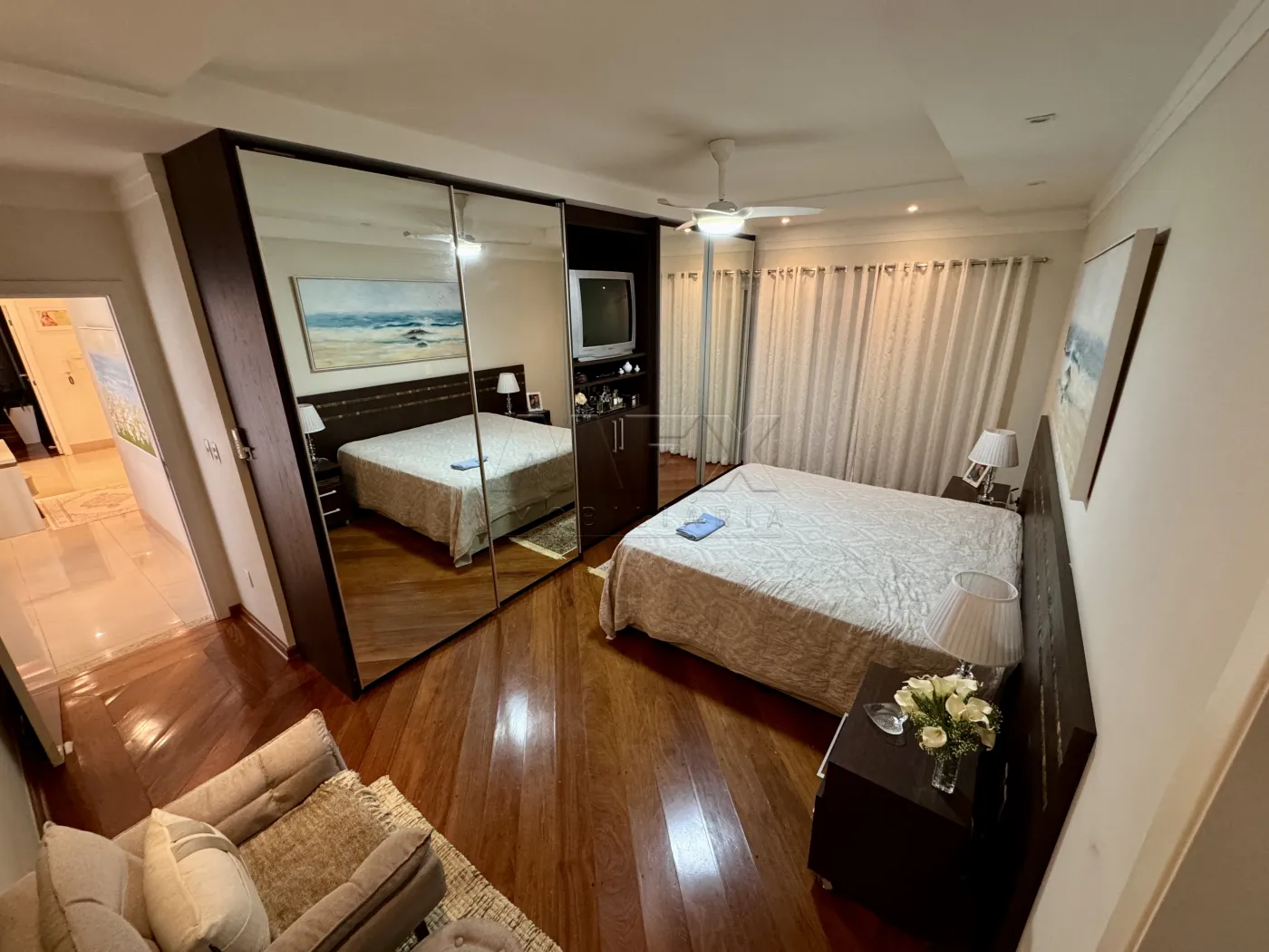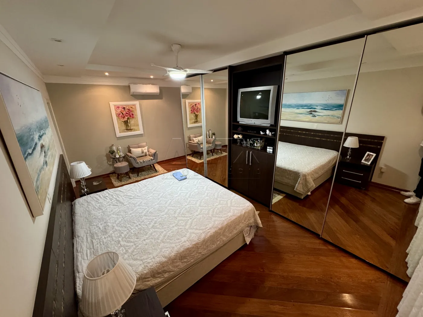 Sala de TV com Home, São 4 suítes bem espaçosas, todas com porta Balcão e acesso ao corredor lateral da casa, todas com armários planejados, ventilador de teto e ar condicionado.